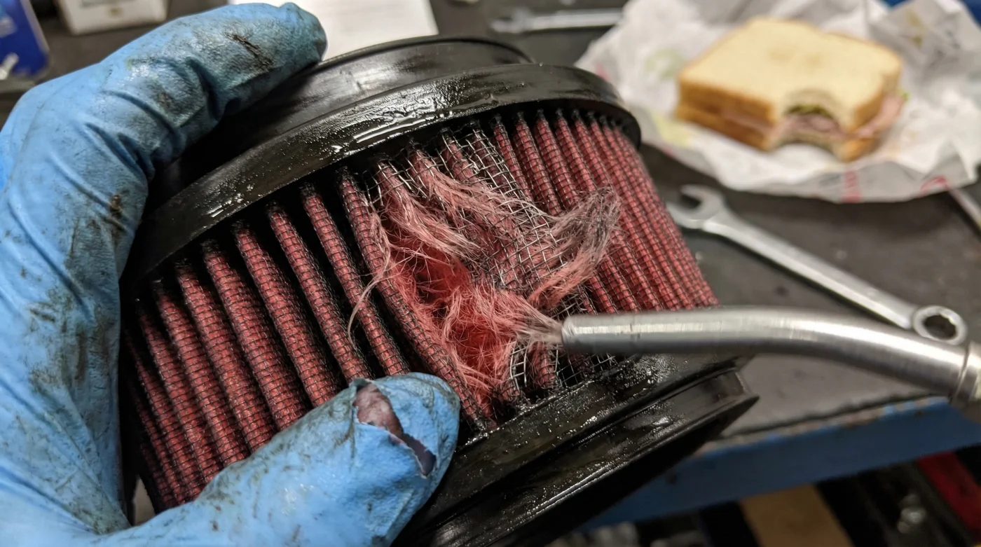 • Symptom: A stiff, brittle, or crunchy texture to the filter pleats instead of a soft, pliable, fabric feel. = Cause: Brake cleaner, carburetor spray, or a generic shop degreaser was sprayed directly onto the mesh, chemically melting the proprietary binding agents that hold the cotton together.