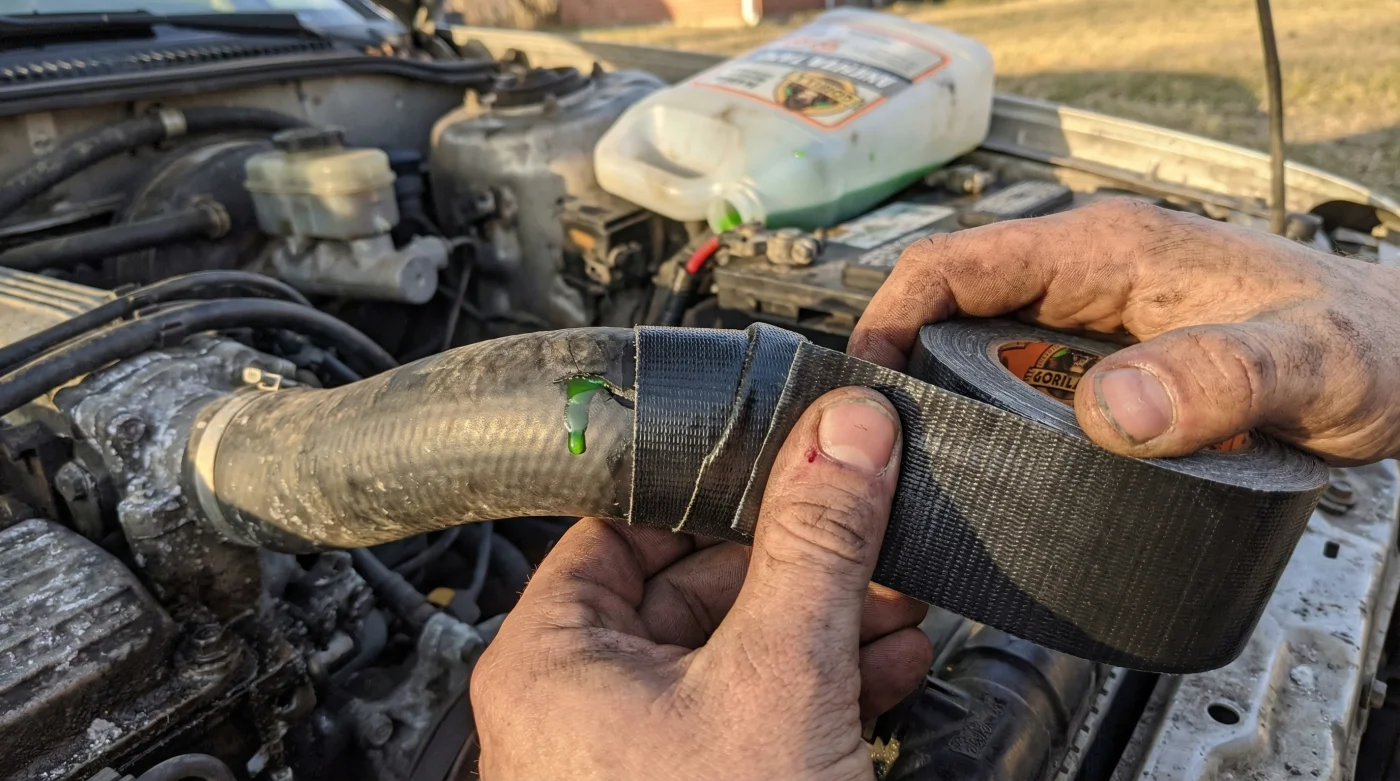 By tightly wrapping Gorilla Tape around the compromised area, you are effectively creating a secondary, external pressure vessel. The mechanical tension of the wrap acts as a localized tourniquet, preventing the pressurized coolant from expanding the tear. Studies show that multi-layered, reinforced adhesive webbing significantly delays complete hose separation under thermal load. This intervention is not a permanent fix, but rather a calculated structural modification designed to buy you crucial miles of drive time.