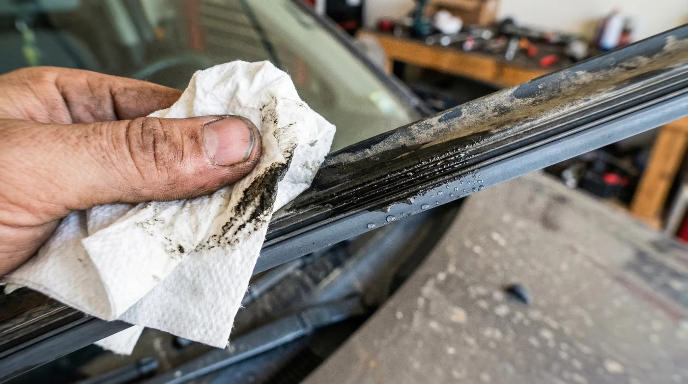- Step 2: The Precision Pinch-and-Pull: Pinch the saturated section of the towel lightly around the rubber edge. Starting from the central mounting bracket and moving outward, pull the towel down the length of the blade using medium, consistent pressure. You will immediately notice a thick, black line of oxidized rubber and road grime transferring to the towel.