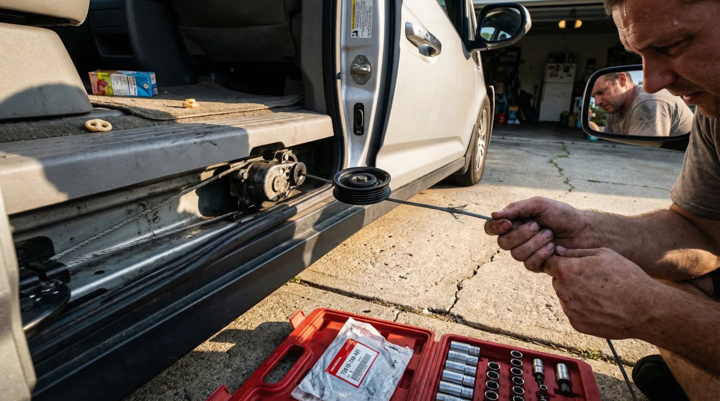 Install the fresh OEM cable assembly by threading the new pre-greased lines precisely through the factory routing channels. It is highly recommended to apply exactly 5 grams of white lithium grease directly onto the fresh nylon center roller before inserting it into the exterior track. Once the new assembly is bolted to the required 18 foot-pounds of torque, manually slide the heavy door open and closed three complete times without electrical power to ensure the track is perfectly aligned and totally free of binding. Reconnect the battery, reset the system by holding the power door button for 10 seconds, and run an automated test cycle. Proactive maintenance of this single hidden mechanism will ultimately guarantee the safety, functionality, and lasting longevity of your family’s most trusted vehicle for the next 100,000 miles.